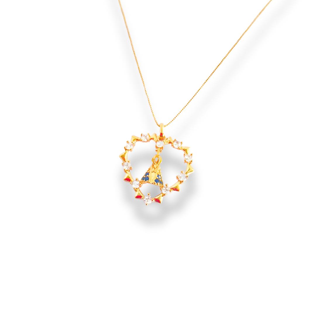 Colar folheado a ouro 18k em corrente veneziana de 45cm, com pingente de Nossa Senhora Aparecida cravejada com strass azuis, dentro de um coração cravejado com strass transparente
