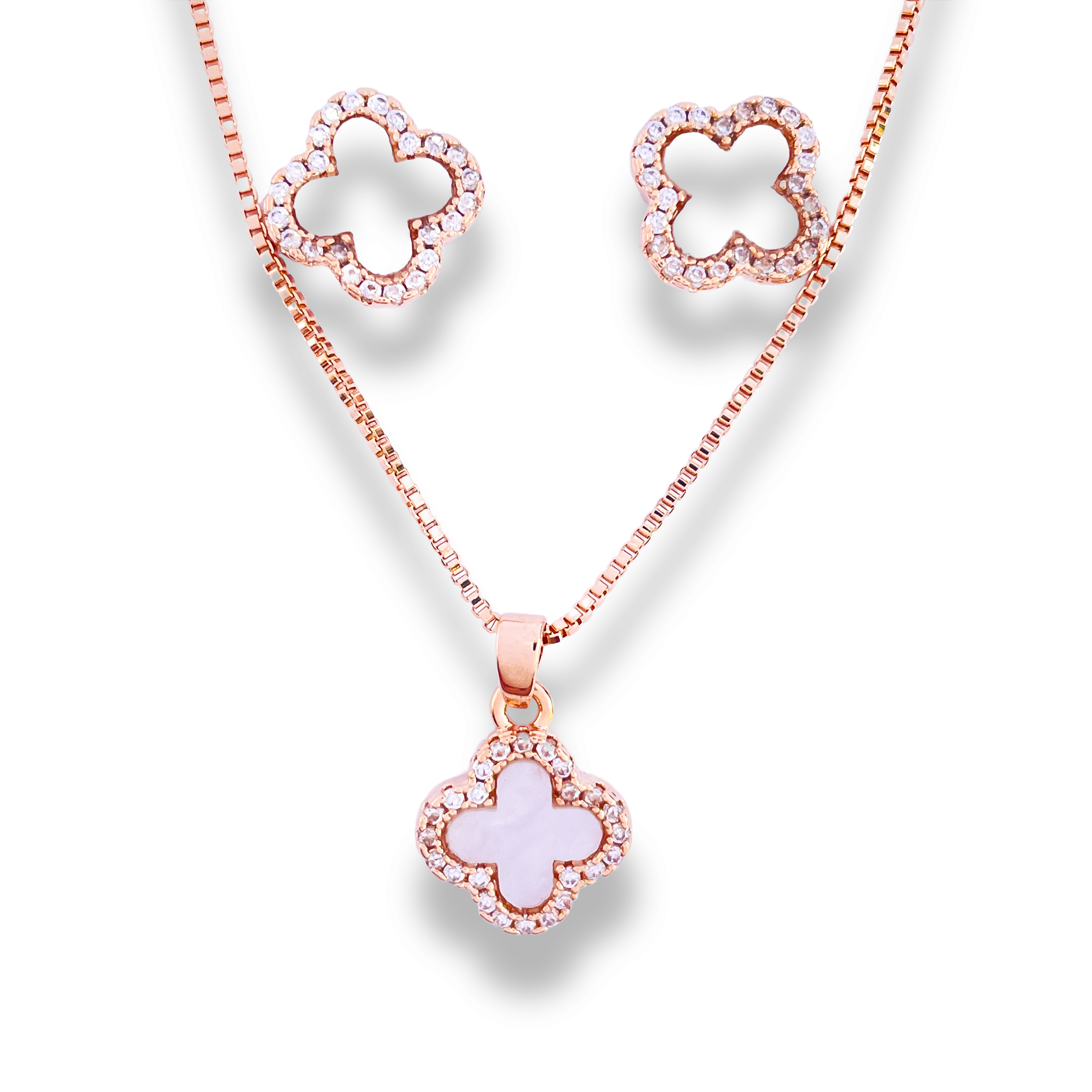 Conjunto folheado a ouro 18k de flor com madrepérola e strass cravejado. O colar possui 45cm de comprimento com extensor.