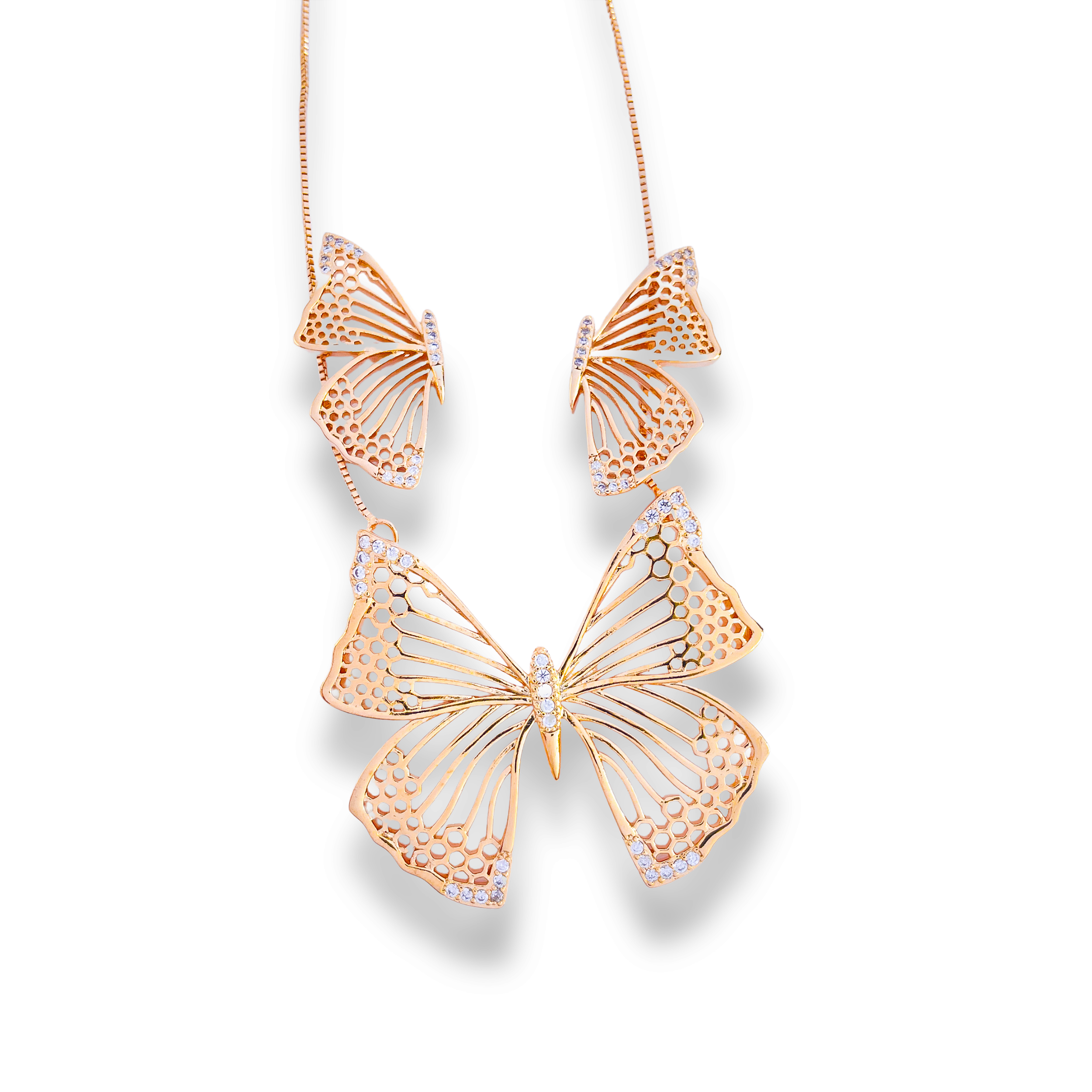Conjunto folheado a ouro 18k de Borboleta cravejado de strass. O colar possui 45cm de comprimento.
